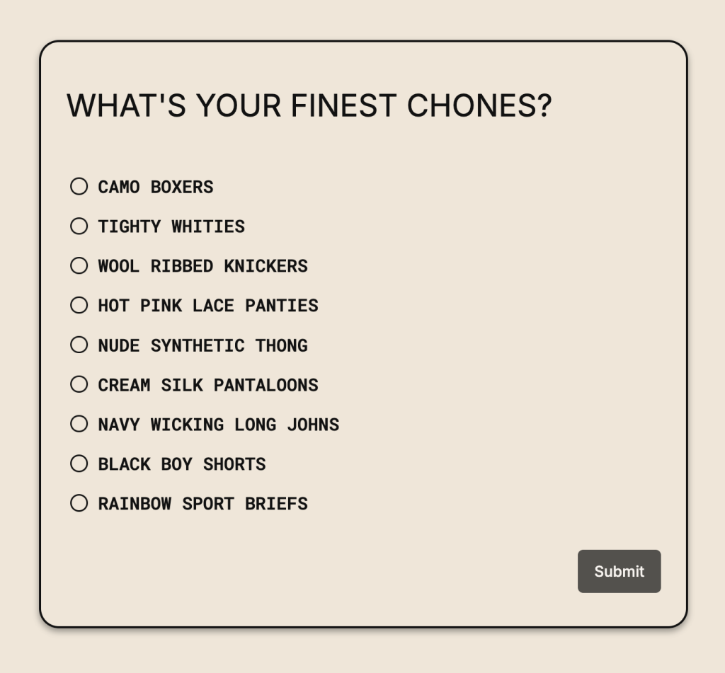 From those 184 DMs, the poll received 86 votes and the web page received 126 views. Camo Boxers and Hot Pink Lace Panties were tied, but not before Camo Boxers took a clear lead. The poll is still live, if you want to vote.